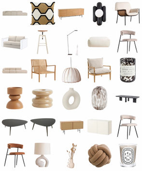 La planche déco/mobilier vous offre un aperçu de l'univers final de votre pièce, en complément du listing shopping complet. C'est une visualisation de votre future décoration, intégrant les couleurs et les articles spécifiques du projet.